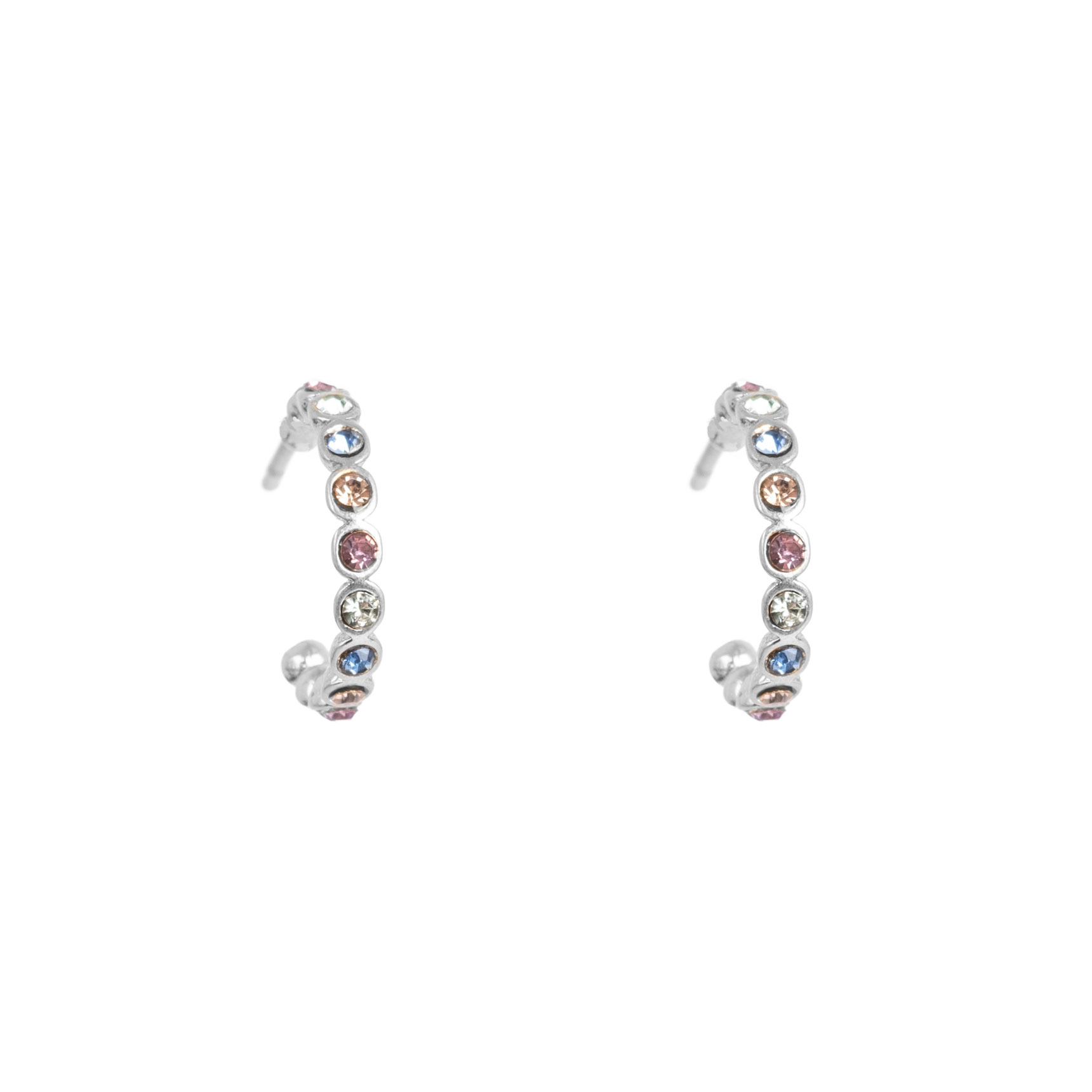 Kleine creolen met een doorsnee van 1.2 CM voorzien van gekleurde kristalsteentjes. Perfect te combineren met Vibrance-ketting ( 2018-1203 ) Silverplated.