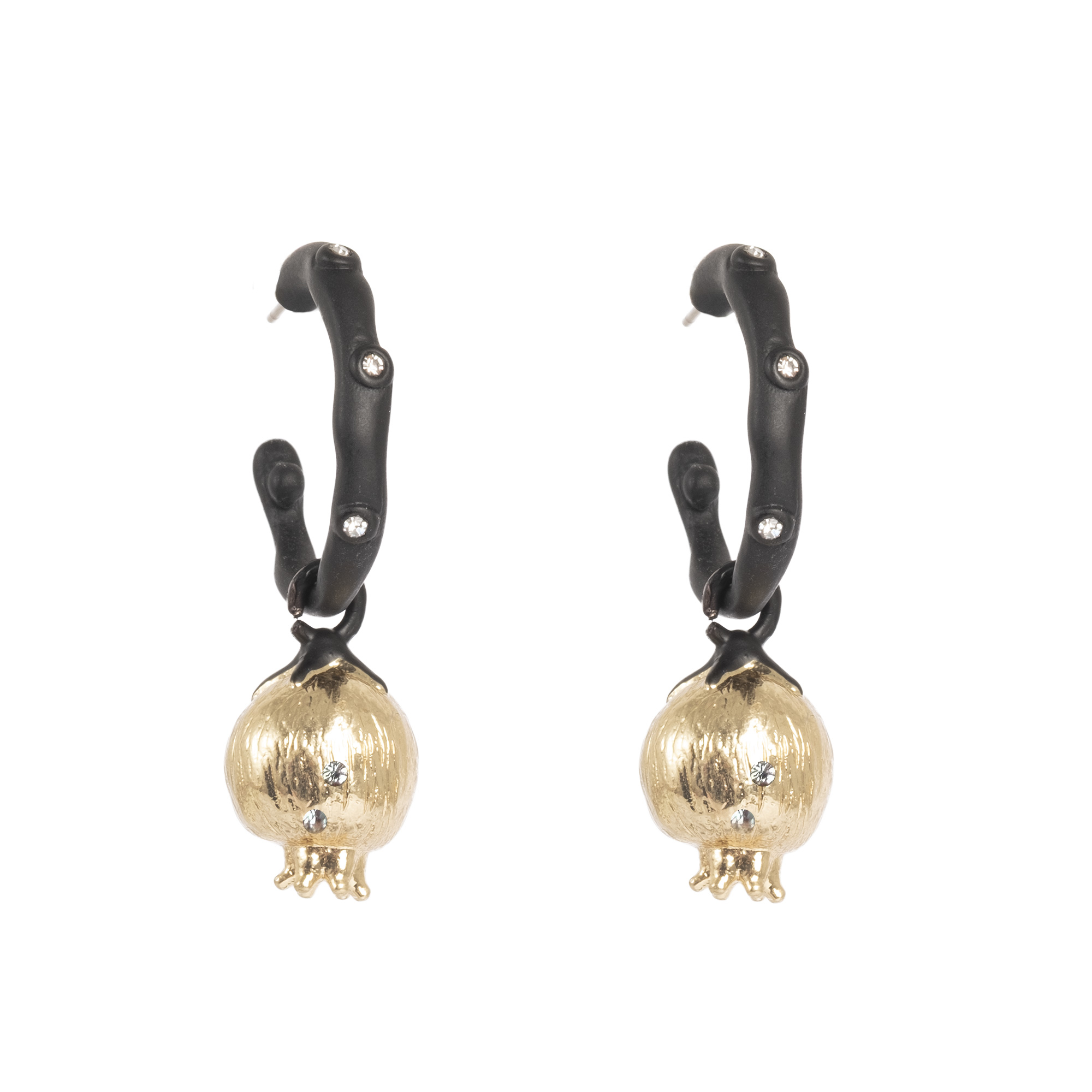 Prachtig ontworpen hoops met daaraan rozenbottels. Zowel de hoops als de rozenbottels zijn belegd met kleine kristalsteentjes. Goldplated.